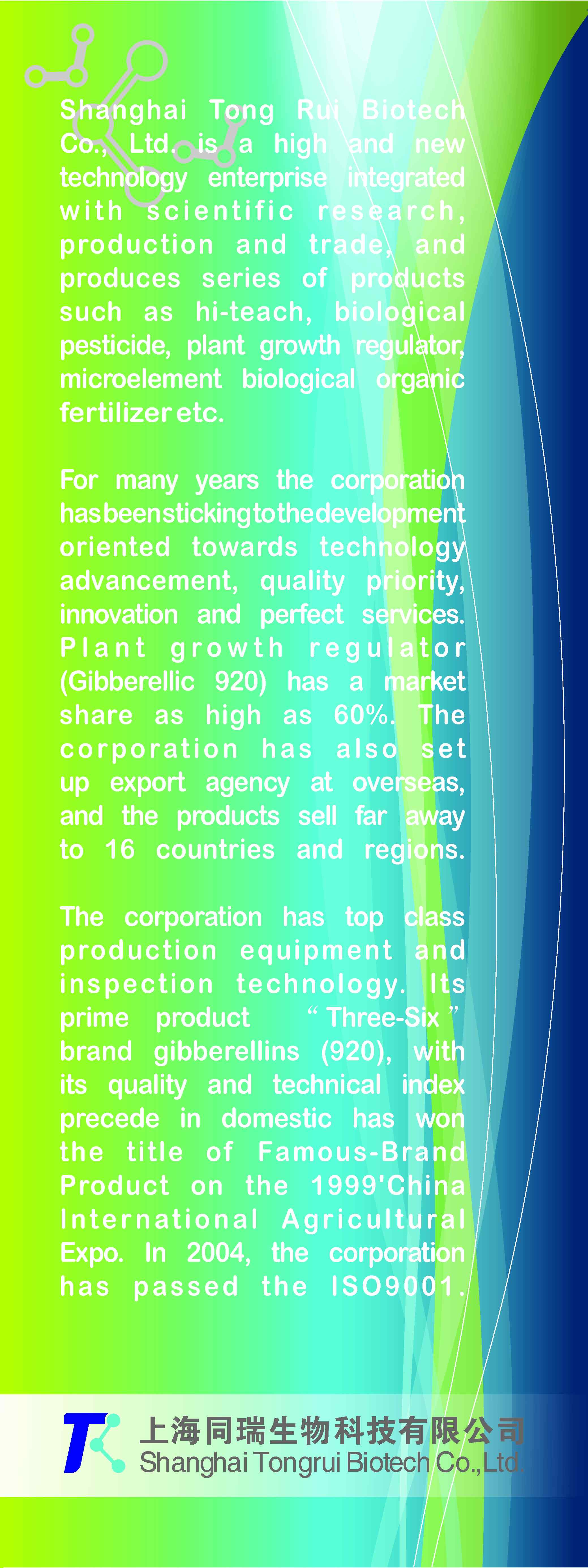 Gibberellin (A3) is one of the best plant growth regulators. The most significant bioactivity of the product is to stimulate elongation of plant cell, to make the plant taller and to make leaves larger. The product can break dormancy of seeds, tuber and root tuber to promote their sprouting, to stimulate fruit growing to increase the percentage of fruiting or to form seedless fruit. It can be used instead of low temperature to promote the plants which need low temperature in their fertile stage to form flower buds ahead of time and can also be used instead of long daylight to make some plants to bloom in short daylight. It can induce the formation of a-amylase and accelerate hydrolysis of stored materials in endosperm cell.